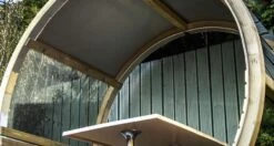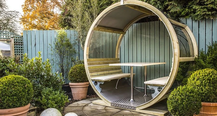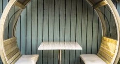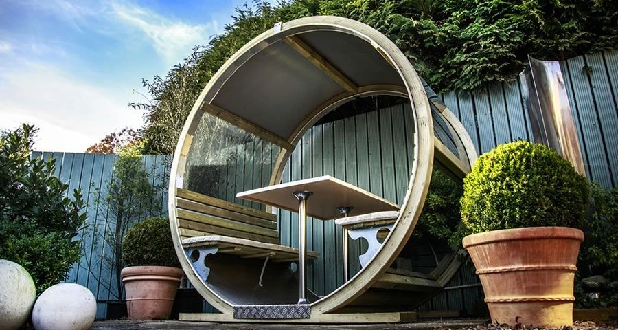 By mounting two pressure treated laminated timber circles opposite each other we have created a cylinder. An 800mm x 1200mm table was then fixed into the centre of the cylinder with two wooden seating sections either side. This leaves you with ample room for six people to be seated within. We have assembled this cylinder Wheel Bench using our signature parts of stainless steel, polycarbonate and timber.